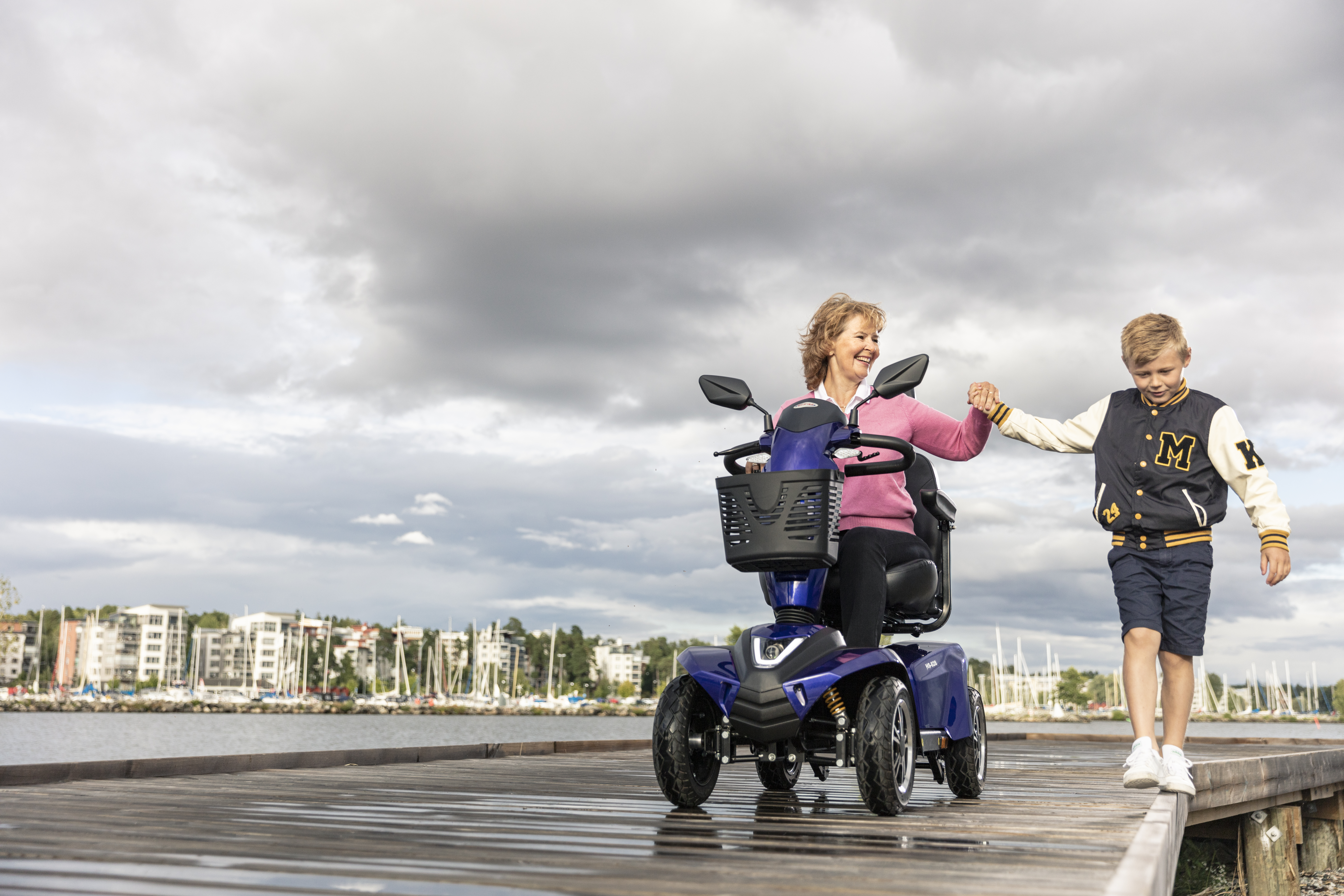 Den har elektromagnetisk parkeringsbroms som går att koppla ur om man behöver rulla den. Blinkers och backspeglar gör den anpassad även för körningi trafikmiljö även i mörker. Den har en topphastighet om 15 kilometer i timmen. Kraftiga fälgar och däck. En verklig glidarskoter med maximal åkkomfort, hög kvalité, snygg design och flera finesser som gör din tur till en härlig upplevelse.